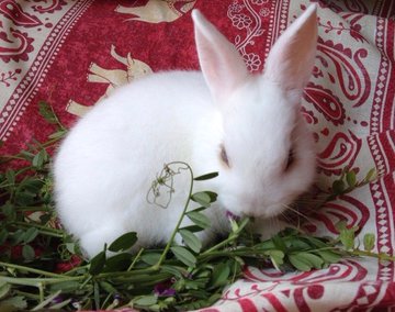 Ille mangia. Preferentia: pelle de pomo (ille lo implora) > alimento pro conilios > pelle de kiwi (fructo) > Phleum pratense (herba sic) ≒ Vicia sativa (herba fresc) > pelle de banana